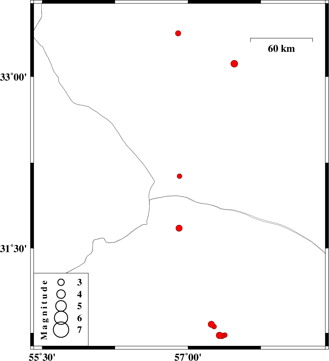 | 2018/10/20 | 06:02:28.6 | 09:32:28.6 | 30.727 | 57.324 | 14 | ML3.1 | Kerman Province, 54 km North-East of Kerman | ||