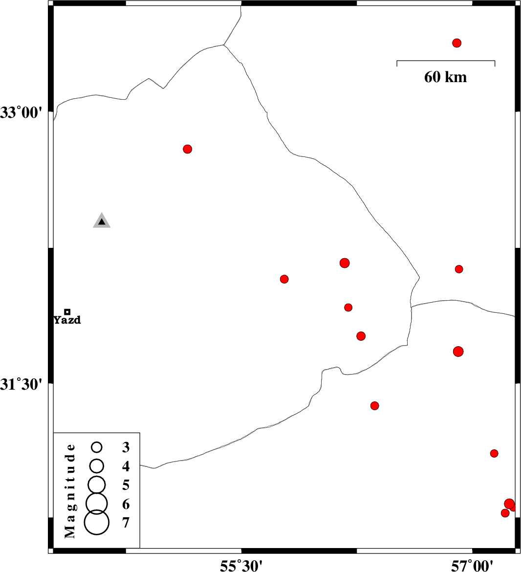 | 2018/10/21 | 02:55:53.6 | 06:25:53.6 | 32.077 | 55.778 | 14 | ML2.4 | Yazd Province, 64 km North-East of Bafq | ||