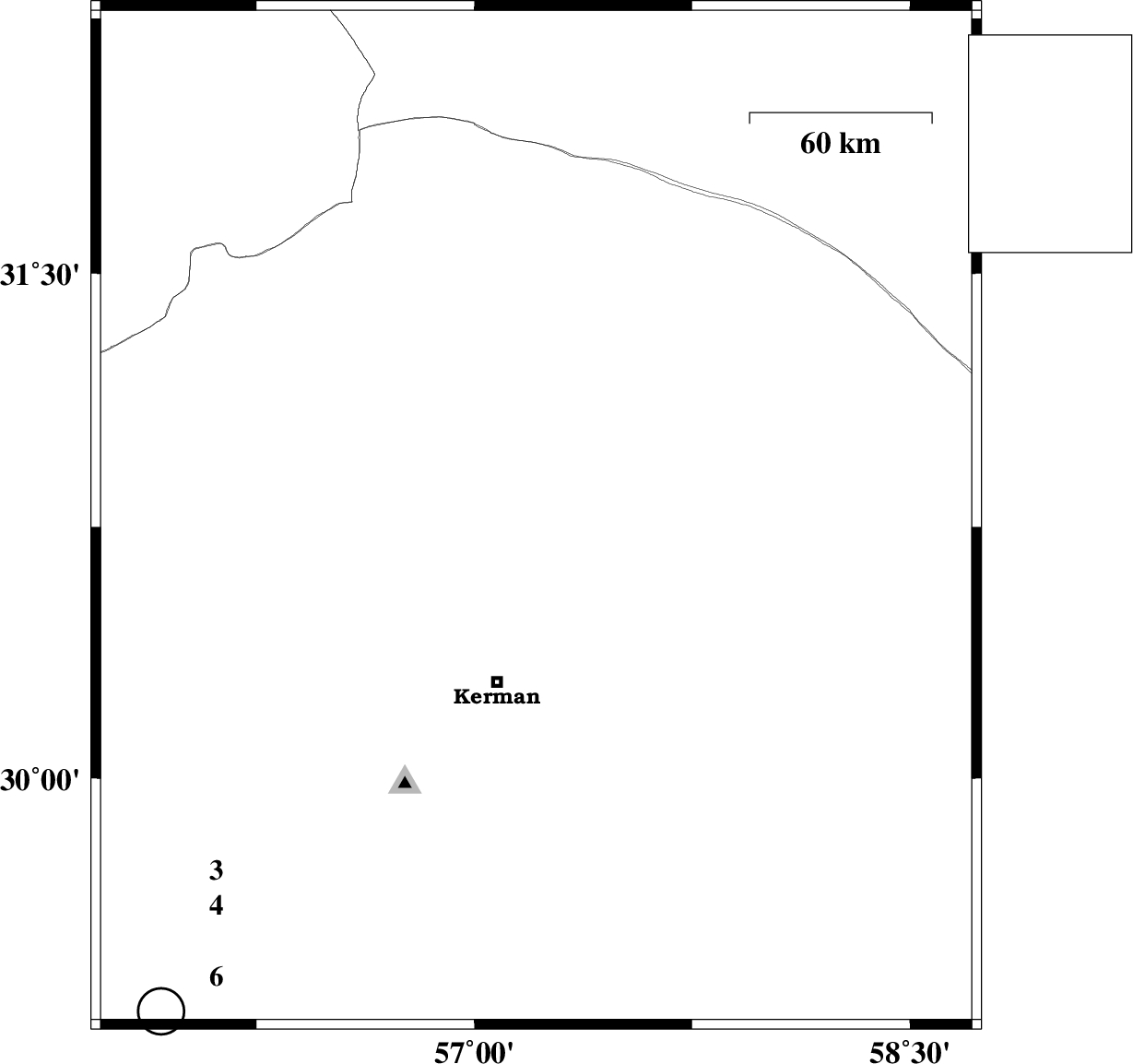 2018/10/21 | 03:11:55.6 | 06:41:55.6 | 30.774 | 57.213 | 14 | ML:2.4 | Kerman Province, 56 km North-East of Kerman | ||