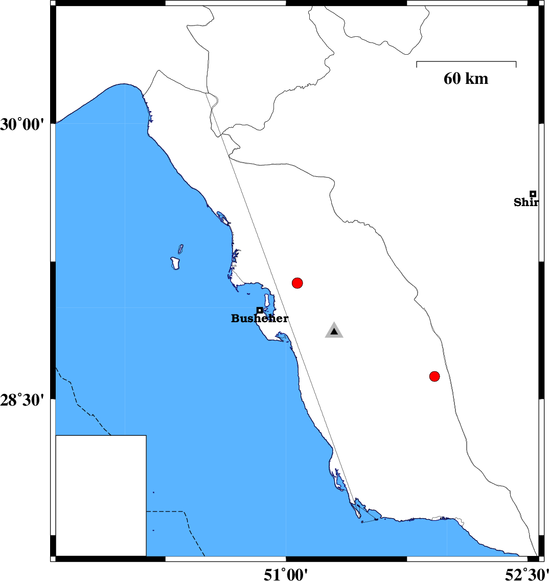 | 2018/10/21 | 04:28:23.7 | 07:58:23.7 | 29.134 | 51.069 | 14 | ML2.9 | Bushehr Province, 19 km South-West of Borazjan | ||
