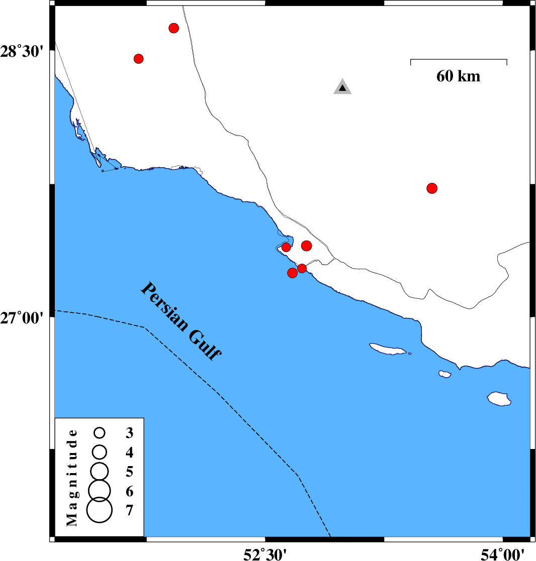 | 2018/10/15 | 20:37:44.4 | 00:07:44.4 | 27.393 | 52.631 | 14 | ML2.6 | Bushehr Province, 31 km South-West of Mehr | ||