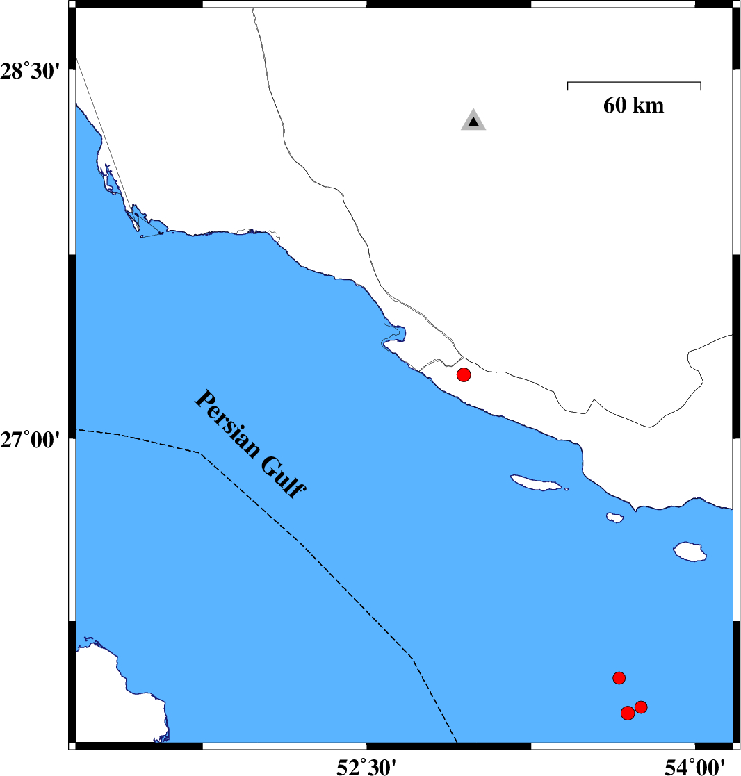 | 2018/10/15 | 20:37:44.4 | 00:07:44.4 | 27.393 | 52.631 | 14 | ML2.6 | Bushehr Province, 31 km South-West of Mehr |