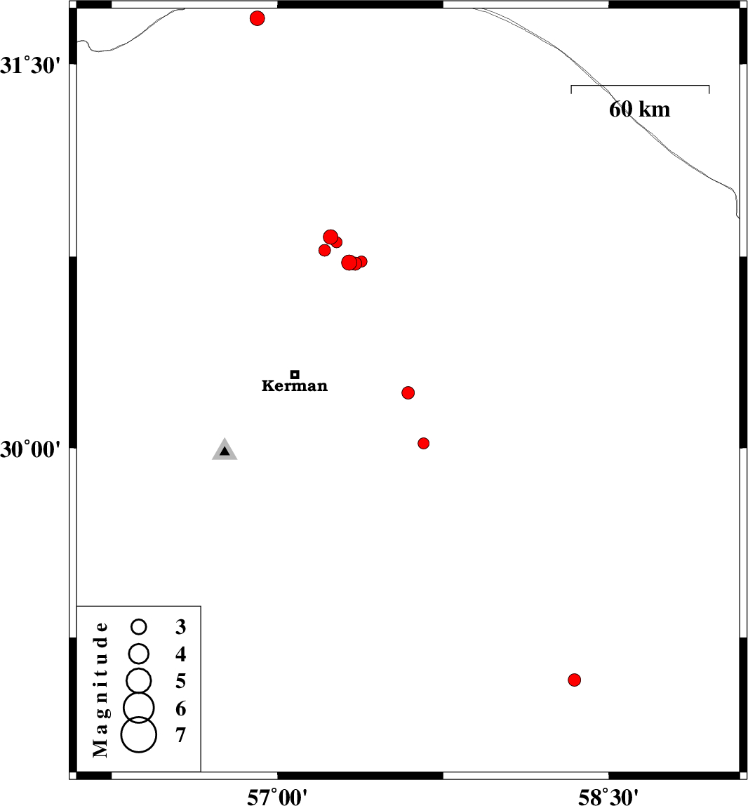 | 2018/10/14 | 14:21:12.2 | 17:51:12.2 | 30.017 | 57.661 | 14 | ML2.3 | Kerman Province, 64 km South-East of Kerman |