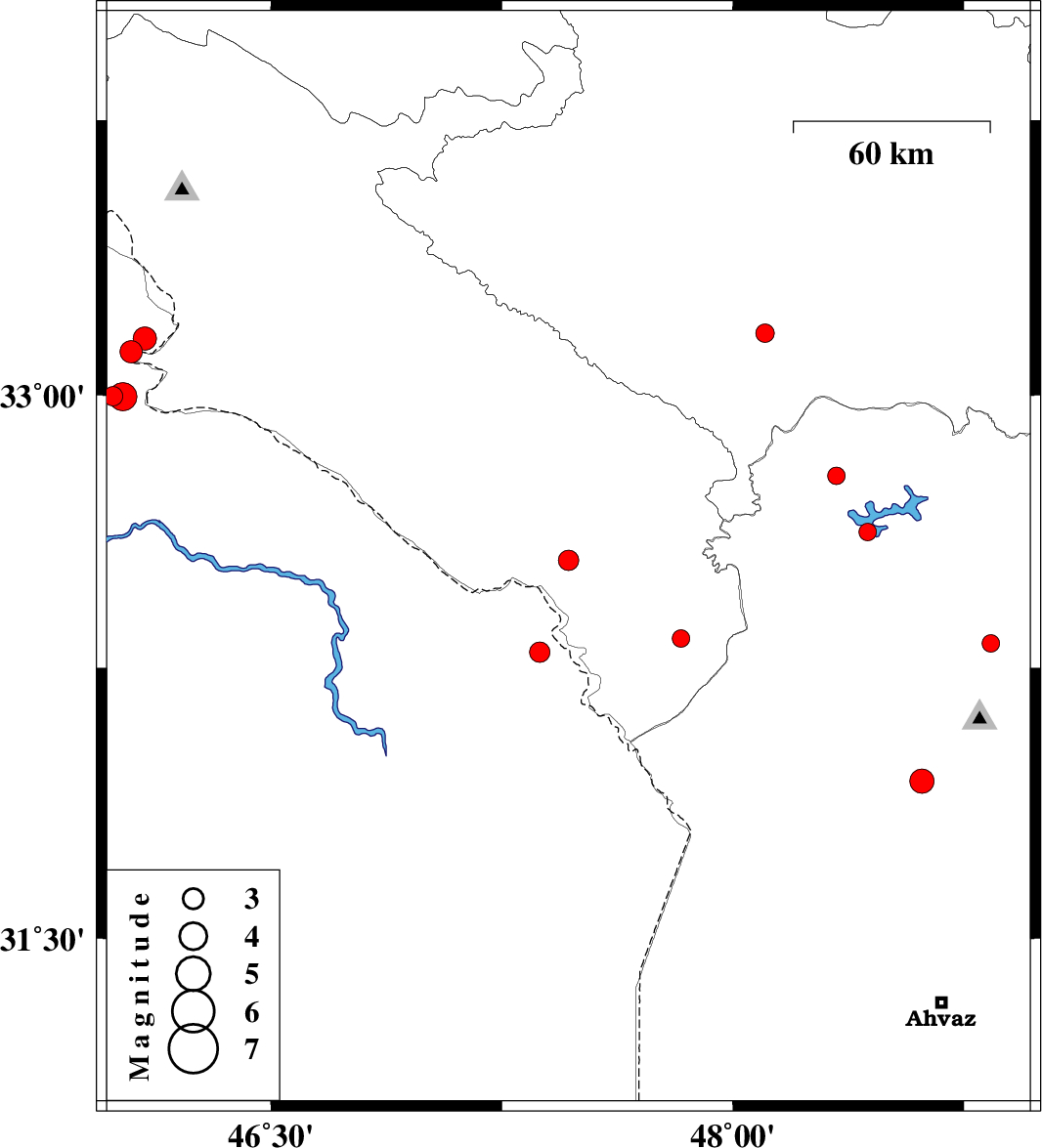 | 2018/09/23 | 08:51:53.1 | 12:21:53.1 | 32.625 | 48.438 | 14 | ML2.5 | Khoozestan Province, 20 km North of Andimeshk |