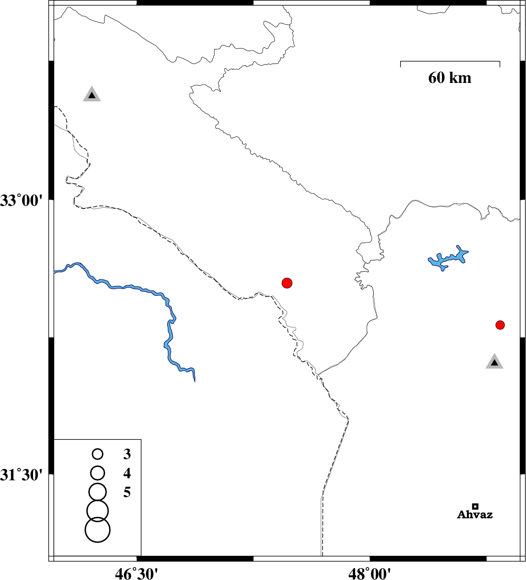 | 2018/10/15 | 17:07:18.1 | 20:37:18.1 | 32.318 | 48.838 | 14 | ML2.5 | Khoozestan Province, 31 km North of Shushtar |