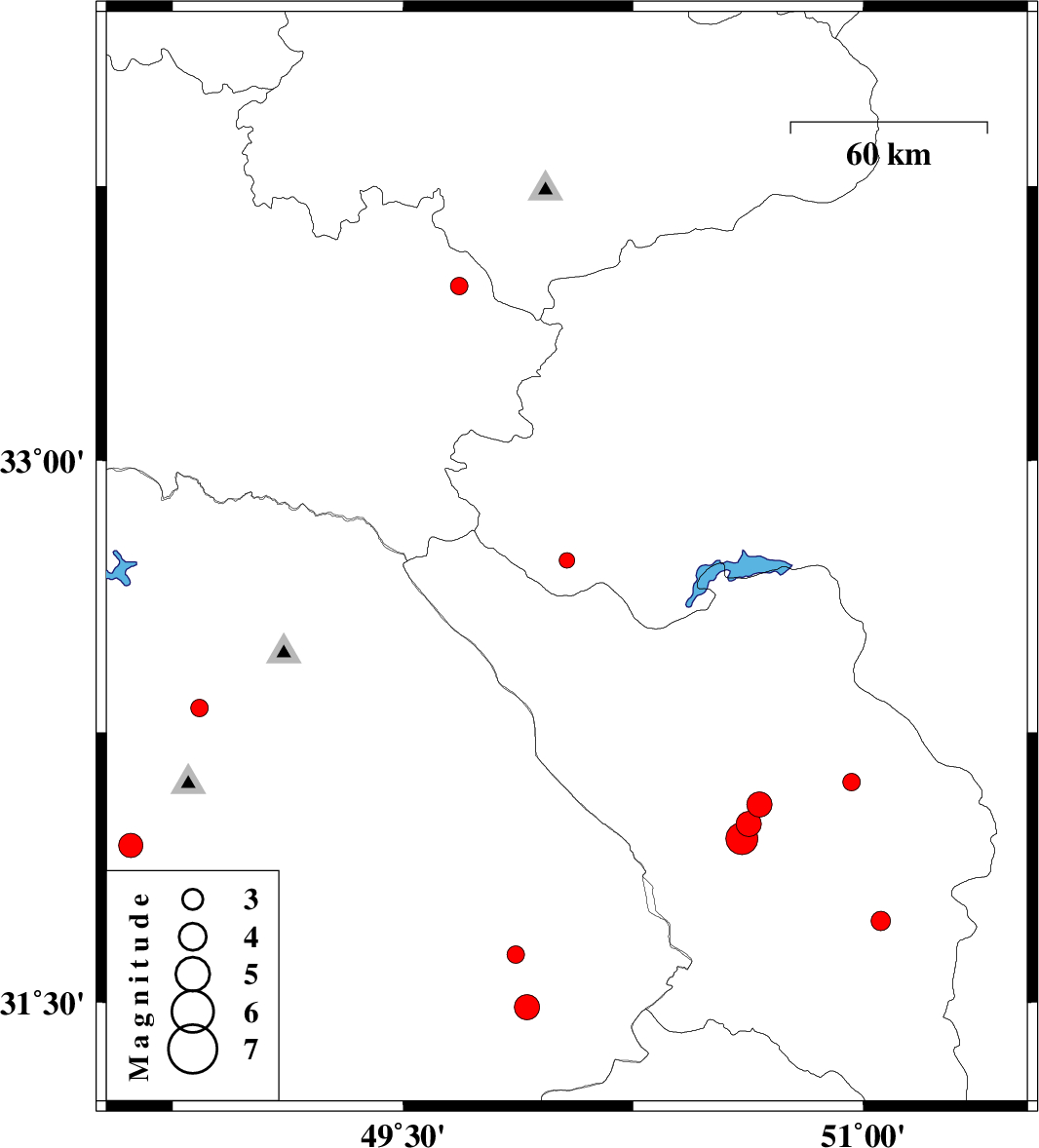 | 2018/10/21 | 20:34:51.5 | 00:04:51.5 | 32.725 | 50.034 | 14 | ML2.3 | Esfahan Province, 25 km South of Fereydunshahr | ||