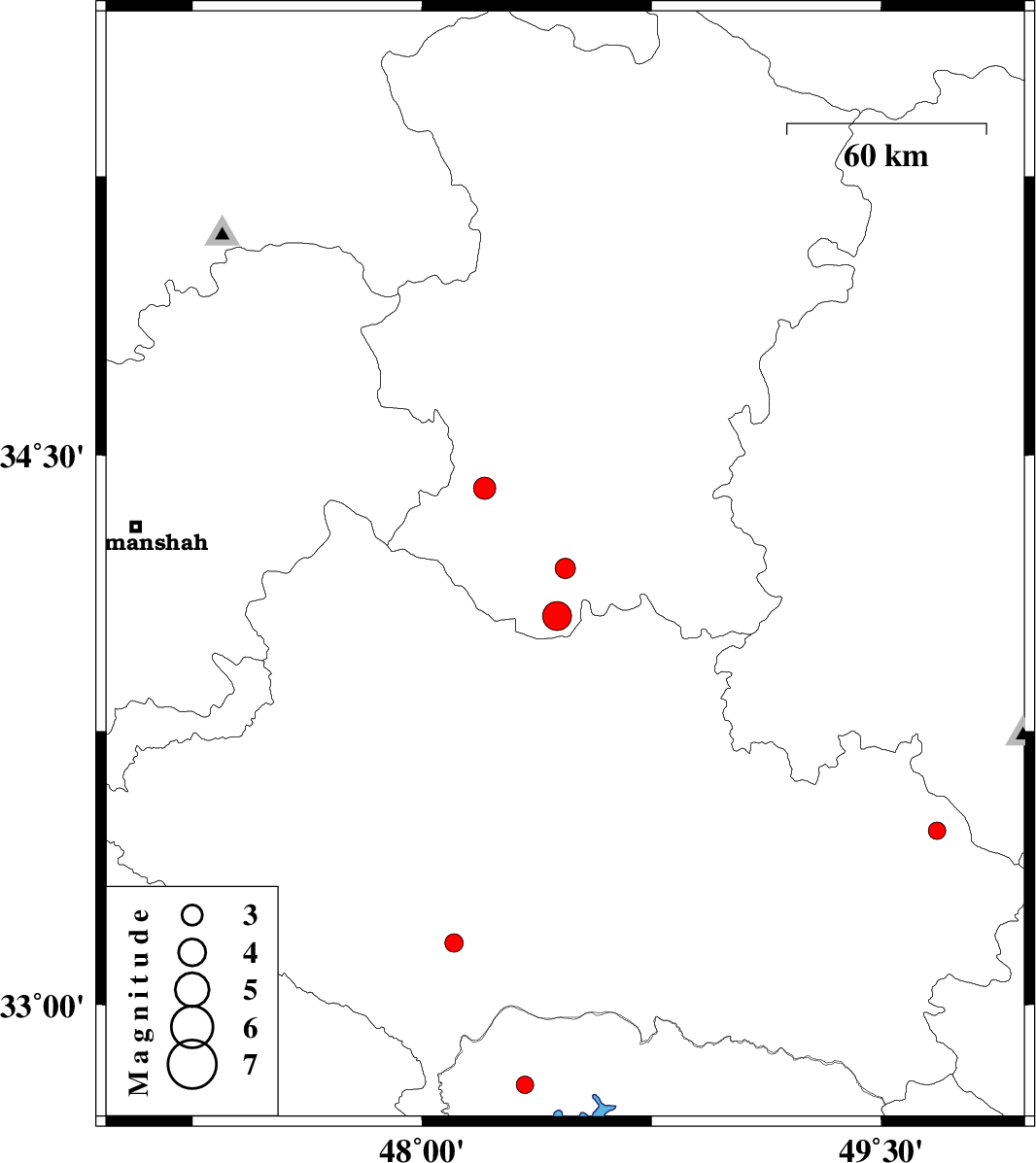 | 2018/10/22 | 03:49:19.1 | 07:19:19.1 | 34.193 | 48.468 | 15 | ML3 | Hamedan Province, 10 km -East of Nahavand | ||