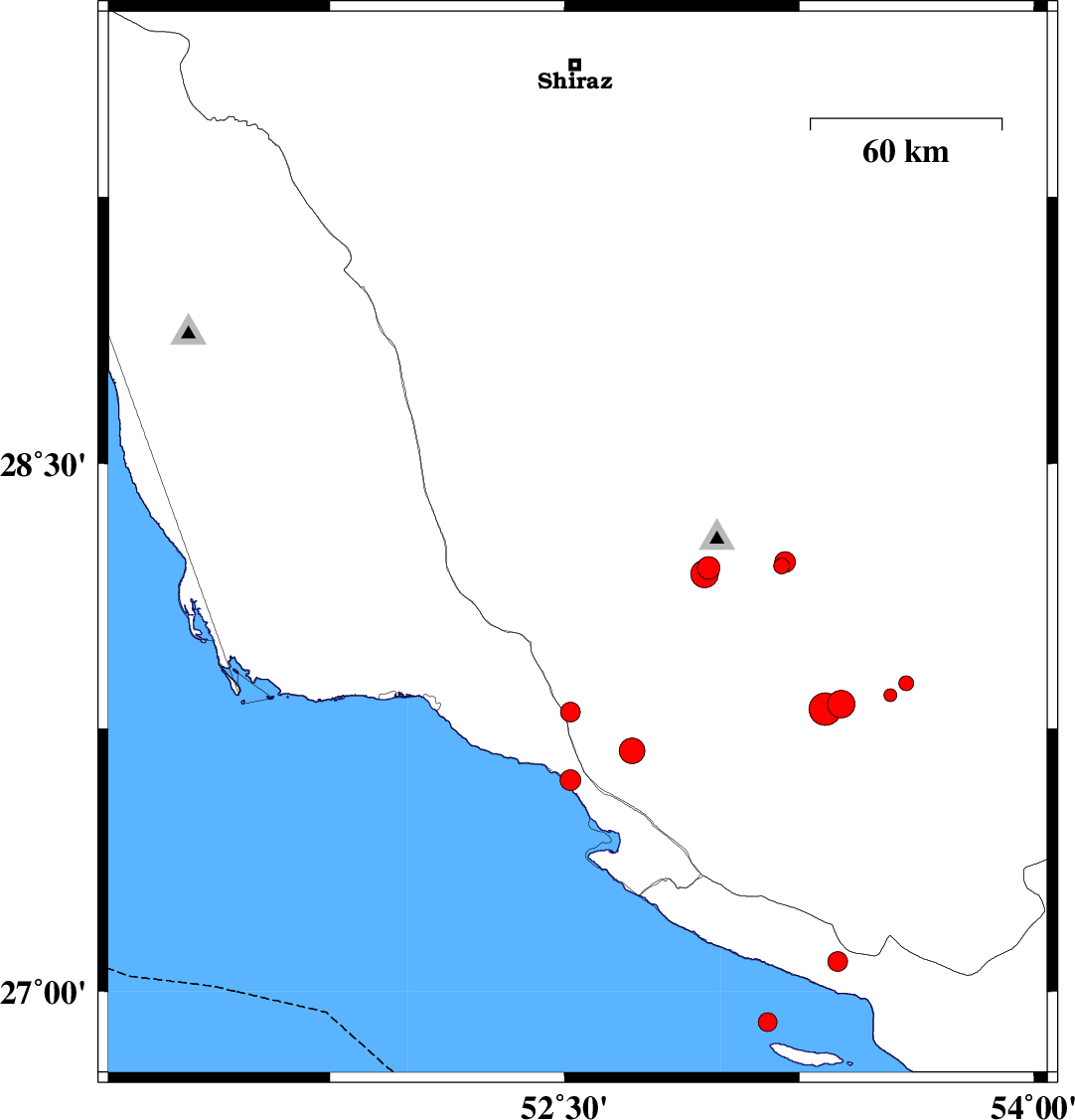 | 2018/10/21 | 04:28:23.7 | 07:58:23.7 | 29.134 | 51.069 | 14 | ML2.9 | Bushehr Province, 19 km South-West of Borazjan | ||