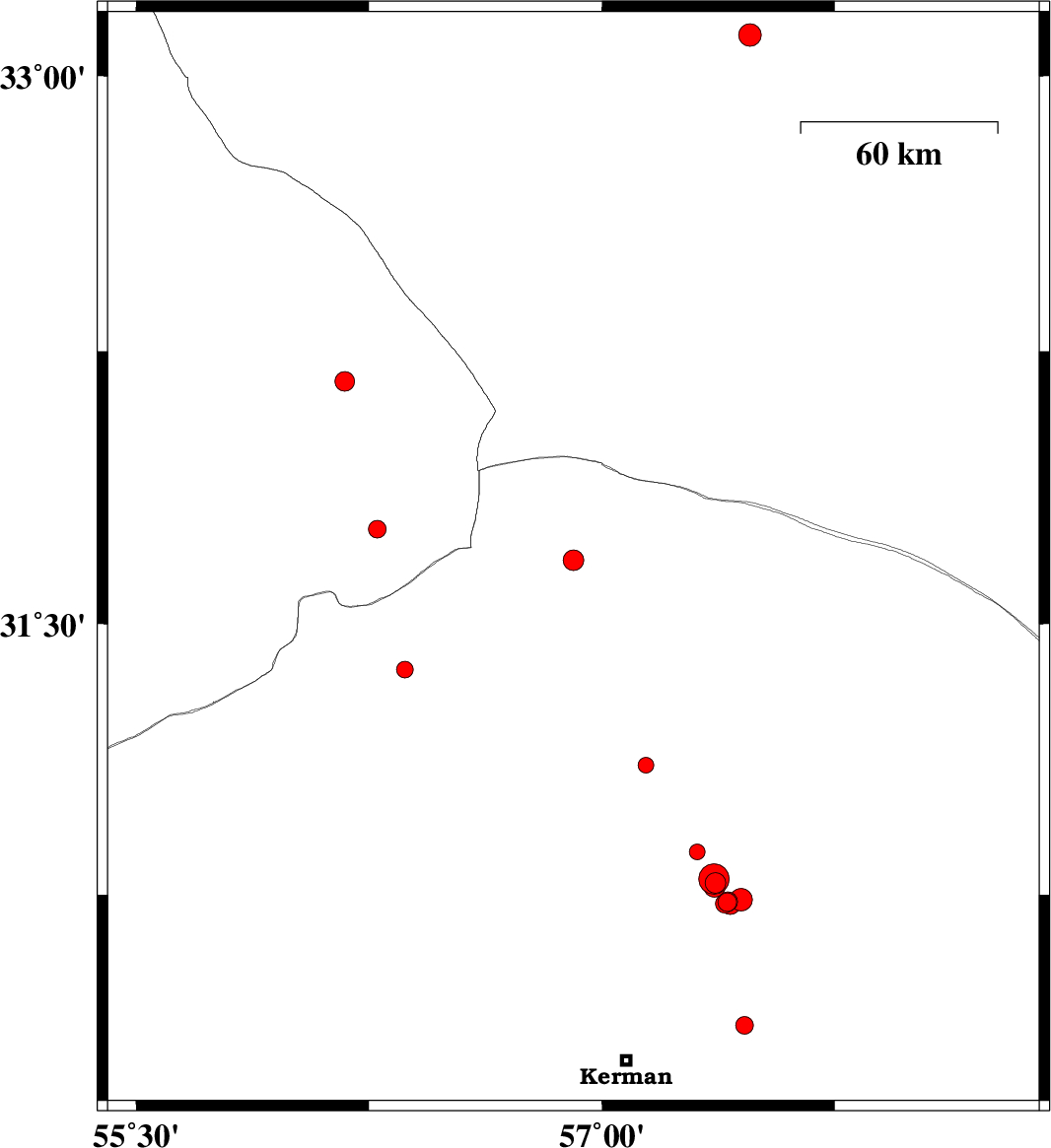 2018/10/08 | 00:34:51.2 | 04:04:51.2 | 30.725 | 57.395 | 14 | ML:2.7 | Kerman Province, 57 km North-East of Kerman | ||