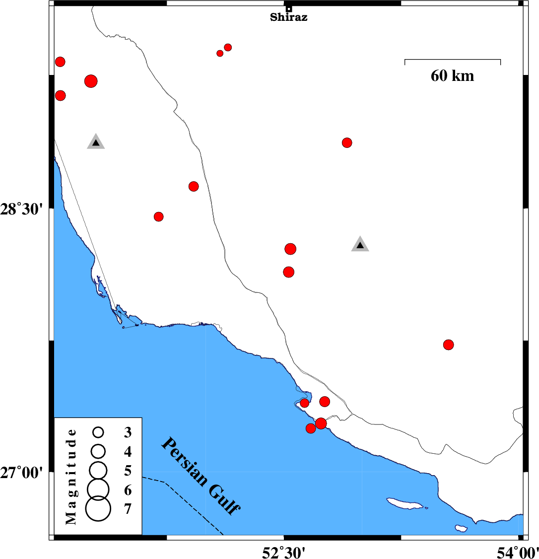 | 2018/10/01 | 08:40:53.9 | 12:10:53.9 | 27.402 | 52.76 | 14 | ML2.9 | Bushehr Province, 20 km South-West of Mehr | ||