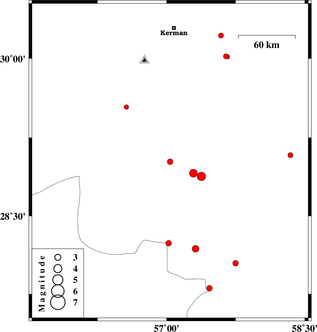 | 2018/09/30 | 13:23:36.6 | 16:53:36.6 | 28.88 | 57.378 | 15 | ML4.2 | Kerman Province, 42 km North-West of Jiroft |