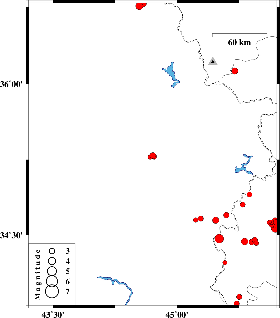 | 2018/10/14 | 15:08:31.5 | 18:38:31.5 | 36.76 | 44.544 | 14 | ML4 | Iraq, 53 km -West of Piranshahr | ||