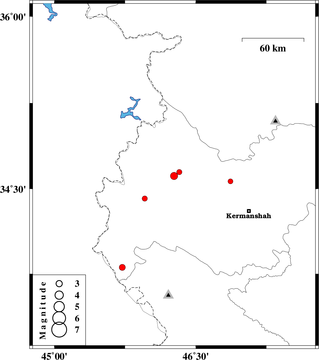| 2018/10/21 | 22:45:24.9 | 02:15:24.9 | 34.566 | 46.868 | 14 | ML2.4 | Kermanshah Province, 29 km South of Kamyaran |