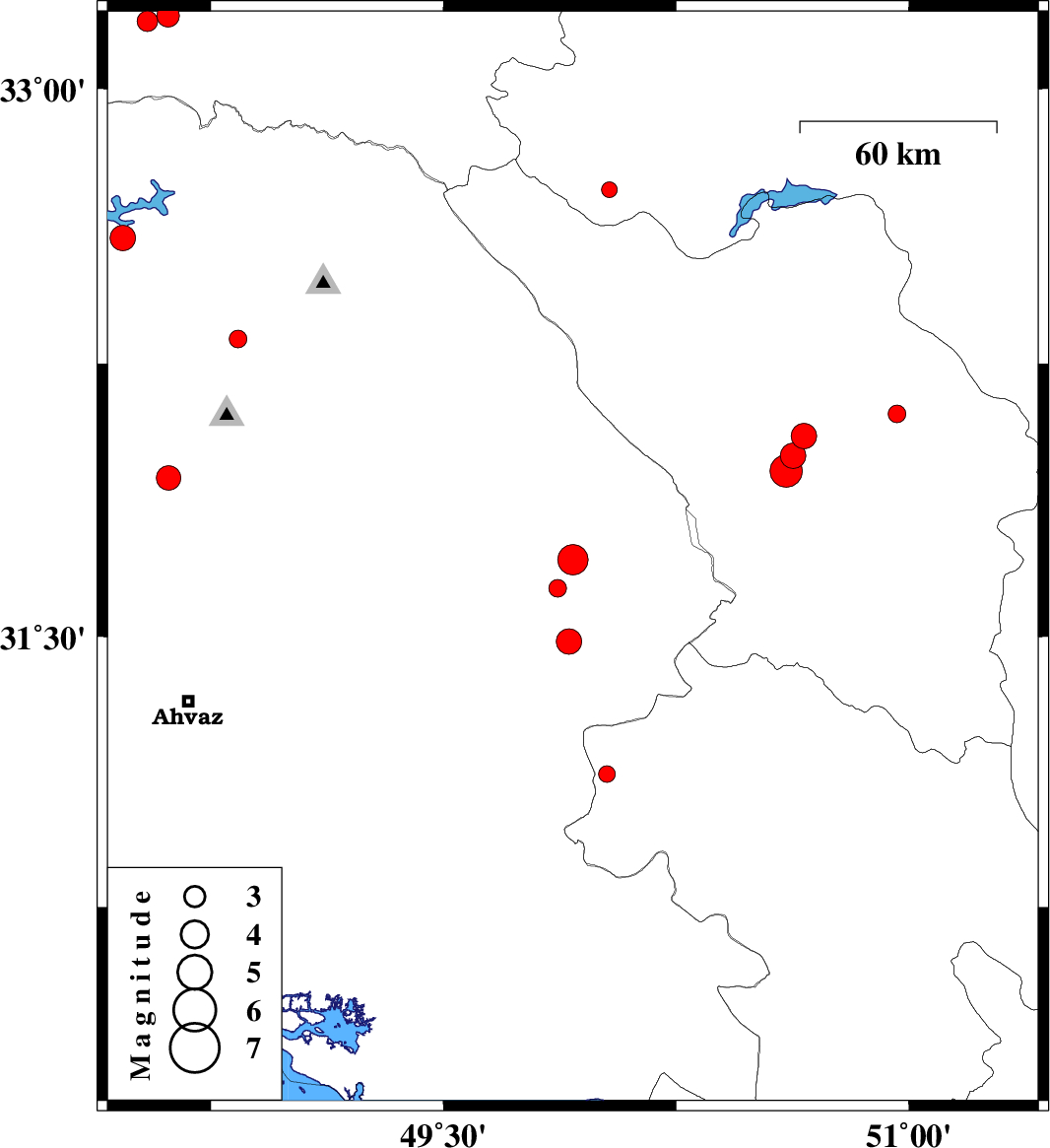| 2018/10/31 | 20:00:19.6 | 23:30:19.6 | 32.594 | 48.467 | 15 | ML3.7 | Khoozestan Province, 18 km North-East of Andimeshk | ||