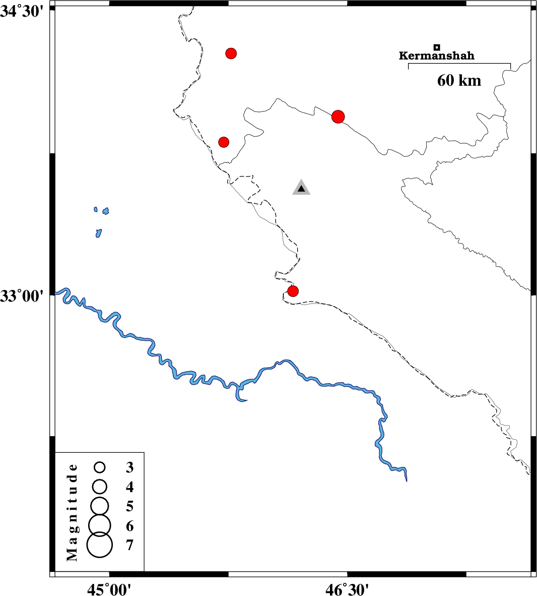 | 2018/10/26 | 19:30:55.3 | 23:00:55.3 | 33.808 | 45.721 | 14 | ML2.9 | Kermanshah Province, 41 km South-West of Gilan-E-Gharb |