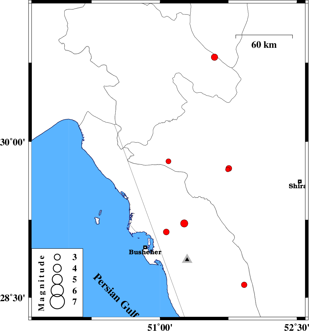 | 2018/10/06 | 01:23:57.1 | 04:53:57.1 | 29.215 | 51.265 | 15 | ML3.7 | Bushehr Province, 8 km of Borazjan |