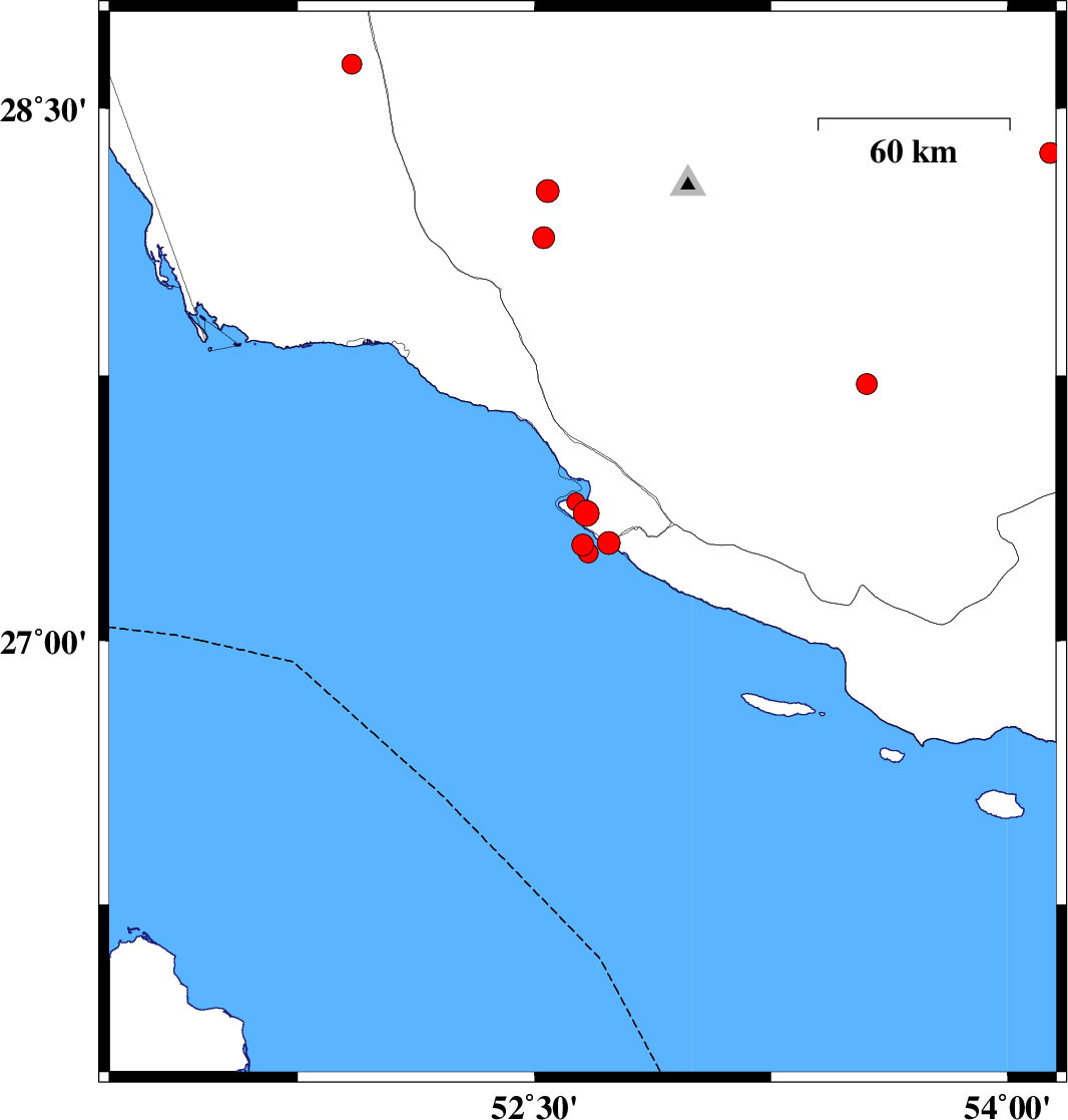 | 2018/10/15 | 20:37:44.4 | 00:07:44.4 | 27.393 | 52.631 | 14 | ML2.6 | Bushehr Province, 31 km South-West of Mehr |