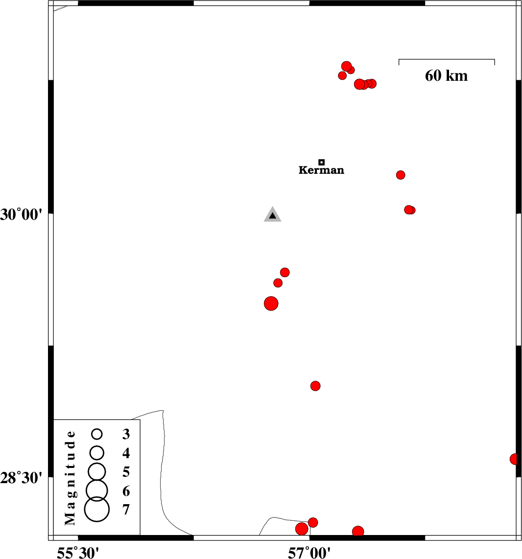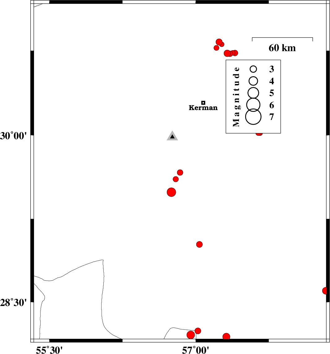 | 2018/11/04 | 02:13:08.1 | 05:43:08.1 | 28.603 | 58.336 | 14 | ML3.3 | Kerman Province, 56 km South of Bam | ||