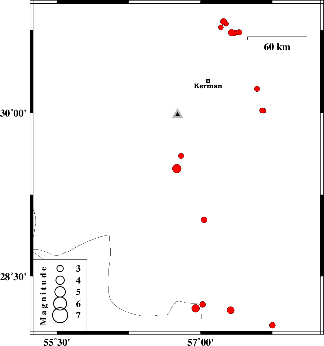| 2018/10/14 | 14:21:12.2 | 17:51:12.2 | 30.017 | 57.661 | 14 | ML2.3 | Kerman Province, 64 km South-East of Kerman | ||