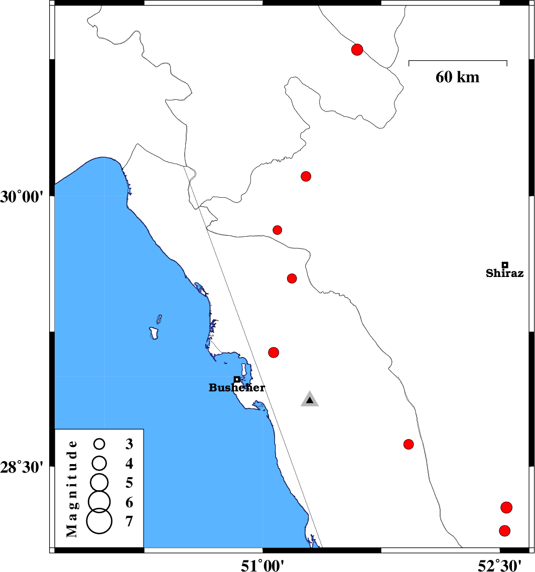 | 2018/11/04 | 15:22:23.1 | 18:52:23.1 | 29.812 | 51.092 | 14 | ML2.5 | Fars Province, 62 km North-West of Borazjan | ||