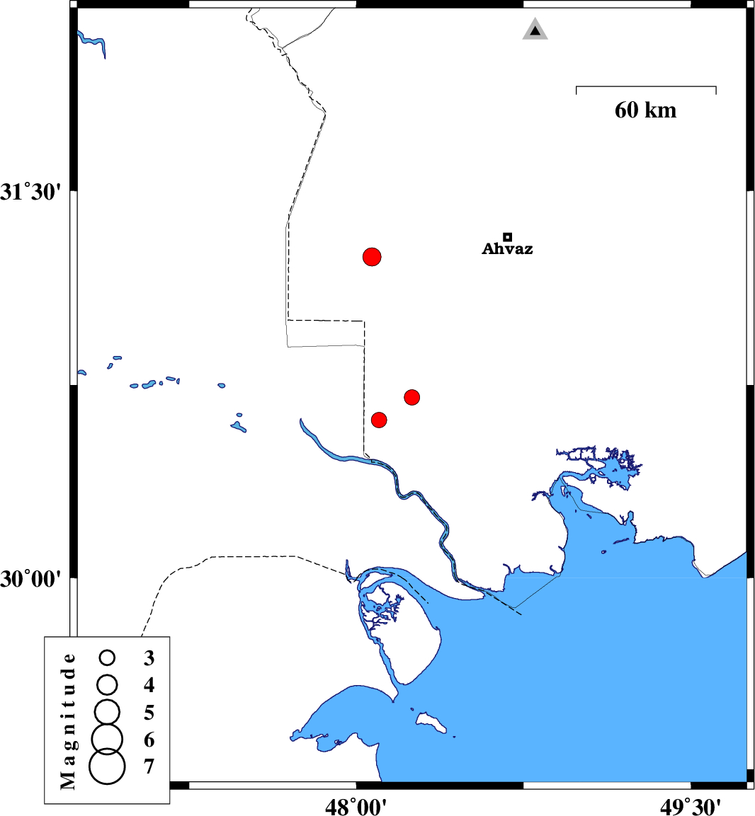 2018/11/12 10:03:27.7 13:33:27.7 30.78948.39715 ML3.1 Khoozestan Province, 27 km North-West of Shadegan