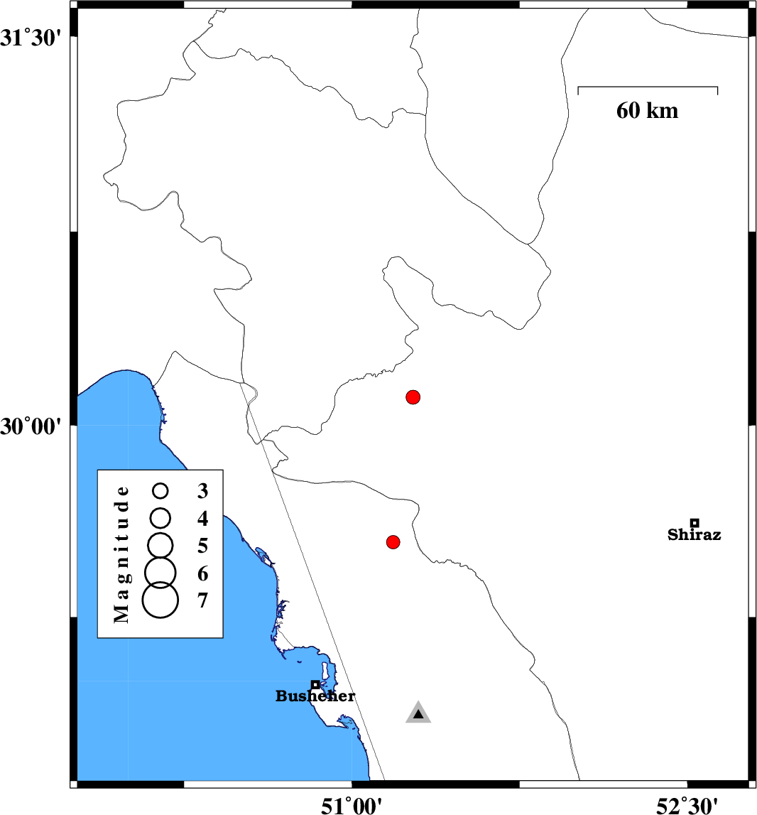 | 2018/11/12 | 05:15:42.2 | 08:45:42.2 | 29.544 | 51.184 | 14 | ML2.7 | Bushehr Province, 31 km North of Borazjan |