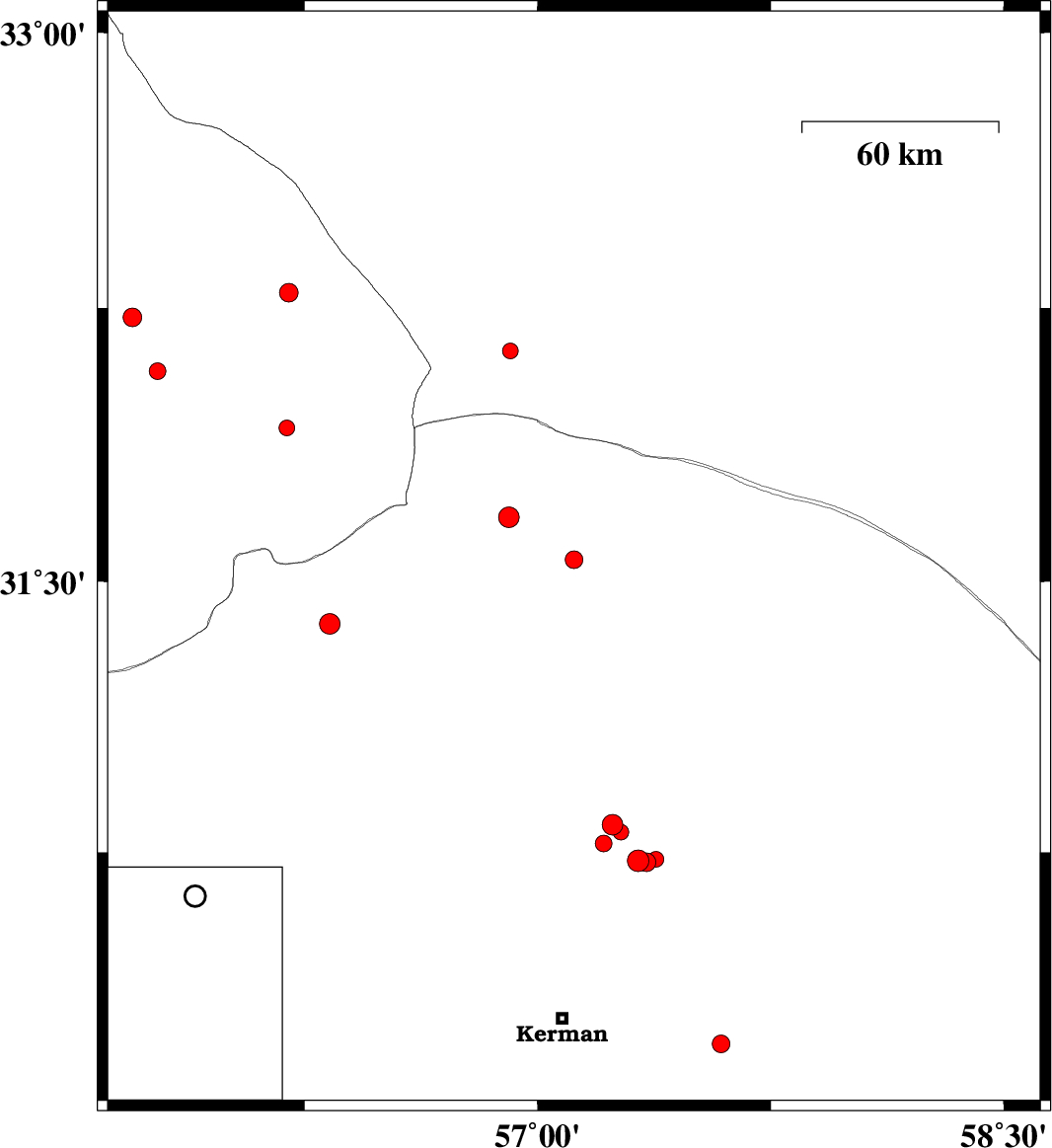 | 2018/10/20 | 06:02:28.6 | 09:32:28.6 | 30.727 | 57.324 | 14 | ML3.1 | Kerman Province, 54 km North-East of Kerman | ||