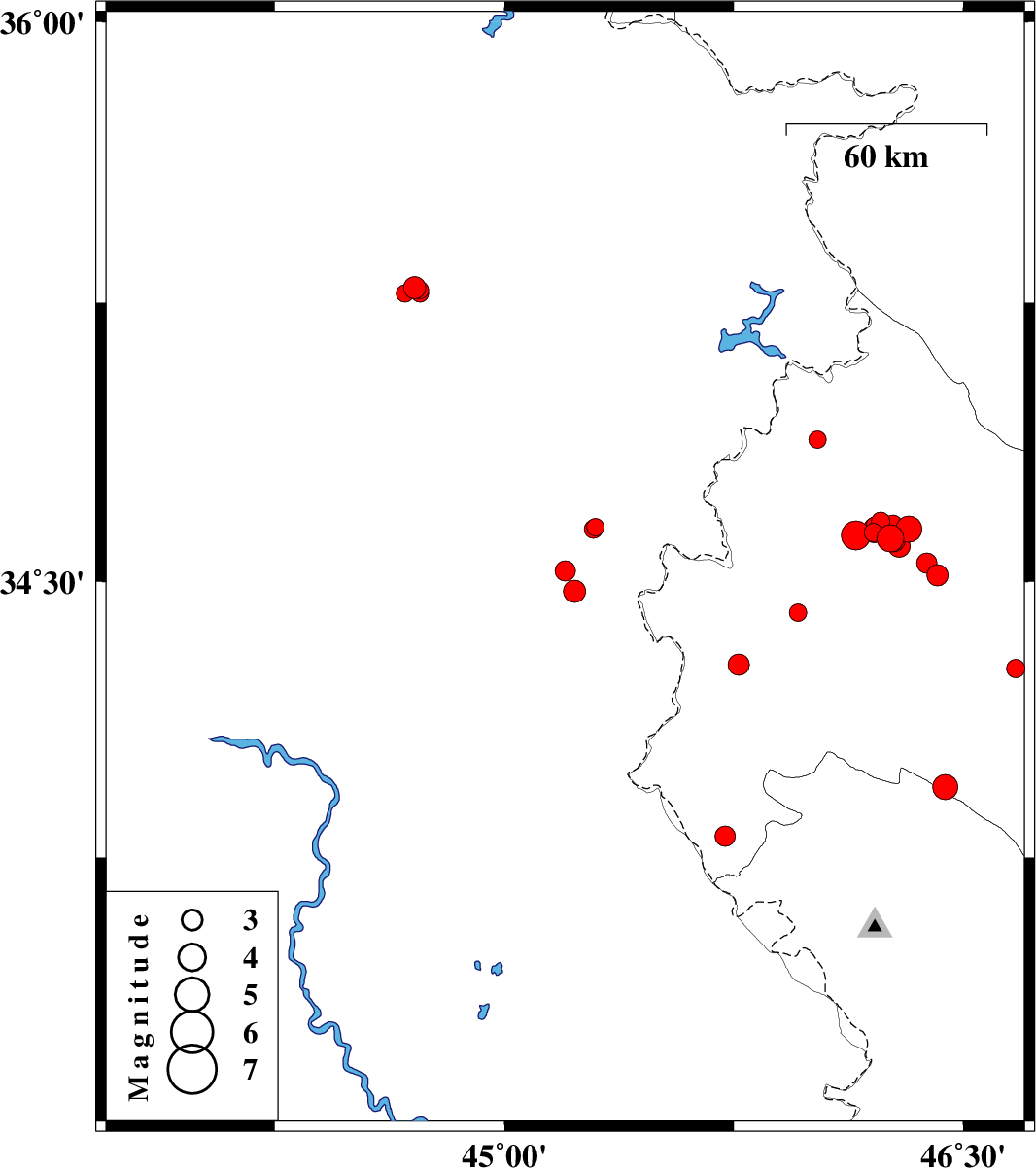 | 2018/11/17 | 19:19:05.2 | 22:49:05.2 | 34.617 | 46.262 | 15 | ML4 | Kermanshah Province, 29 km South-West of Javanrud | ||