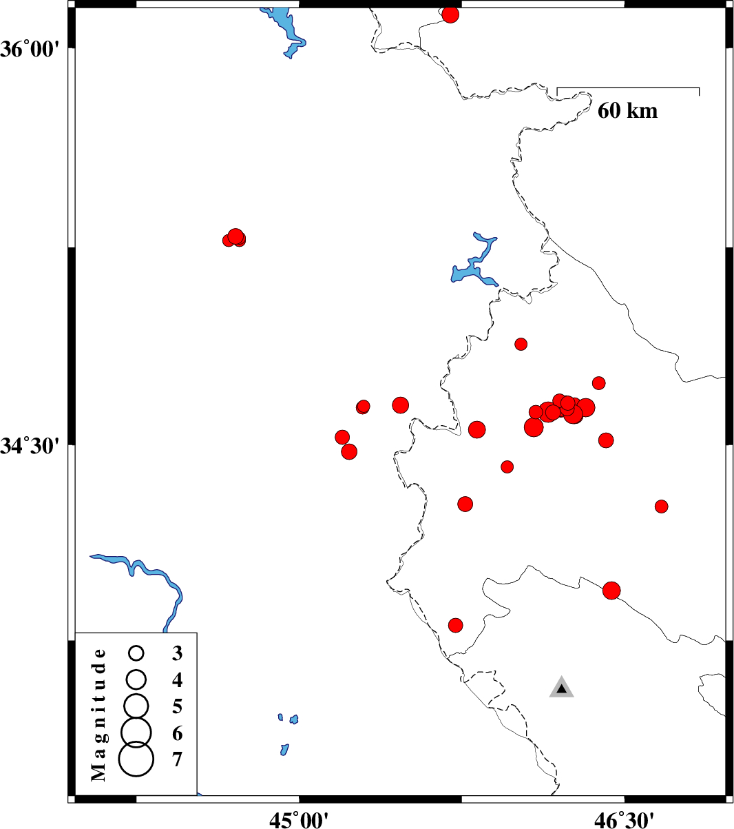 | 2018/11/17 | 19:19:05.2 | 22:49:05.2 | 34.617 | 46.262 | 15 | ML4 | Kermanshah Province, 29 km South-West of Javanrud | ||