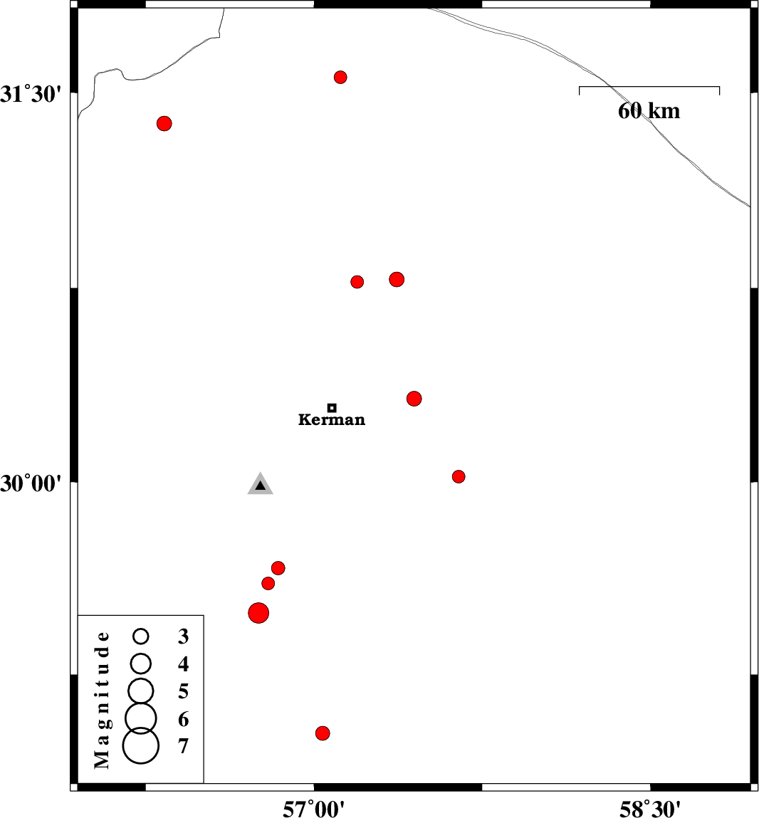 | 2018/11/16 | 16:10:13.3 | 19:40:13.3 | 30.784 | 57.369 | 14 | ML2.9 | Kerman Province, 62 km North-East of Kerman | ||