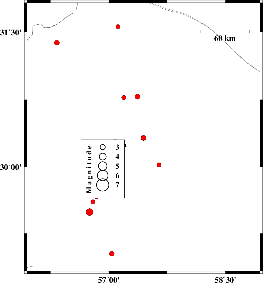 | 2018/11/09 | 10:13:50.1 | 13:43:50.1 | 29.49 | 56.752 | 7 | ML4.1 | Kerman Province, 32 km North-East of Baft | ||