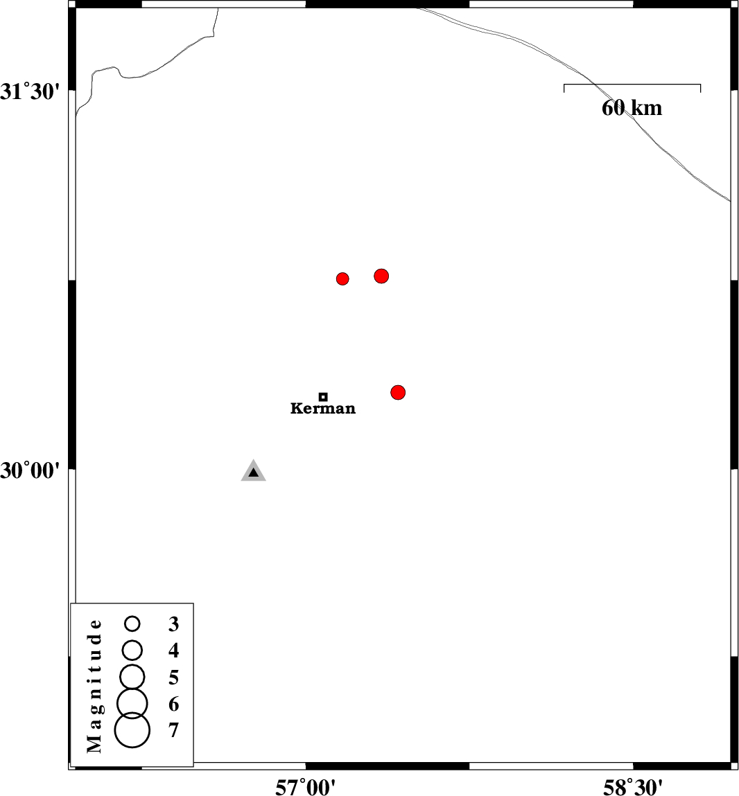 | 2018/11/16 | 16:10:13.3 | 19:40:13.3 | 30.784 | 57.369 | 14 | ML2.9 | Kerman Province, 62 km North-East of Kerman |