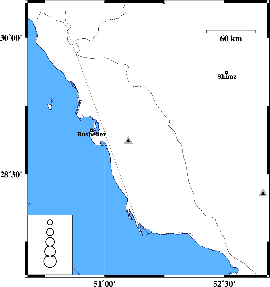 2018/11/26 | 00:49:47.5 | 04:19:47.5 | 28.88 | 51.536 | 10 | ML3.7 | Bushehr Province, 27 km -East of Ahram |