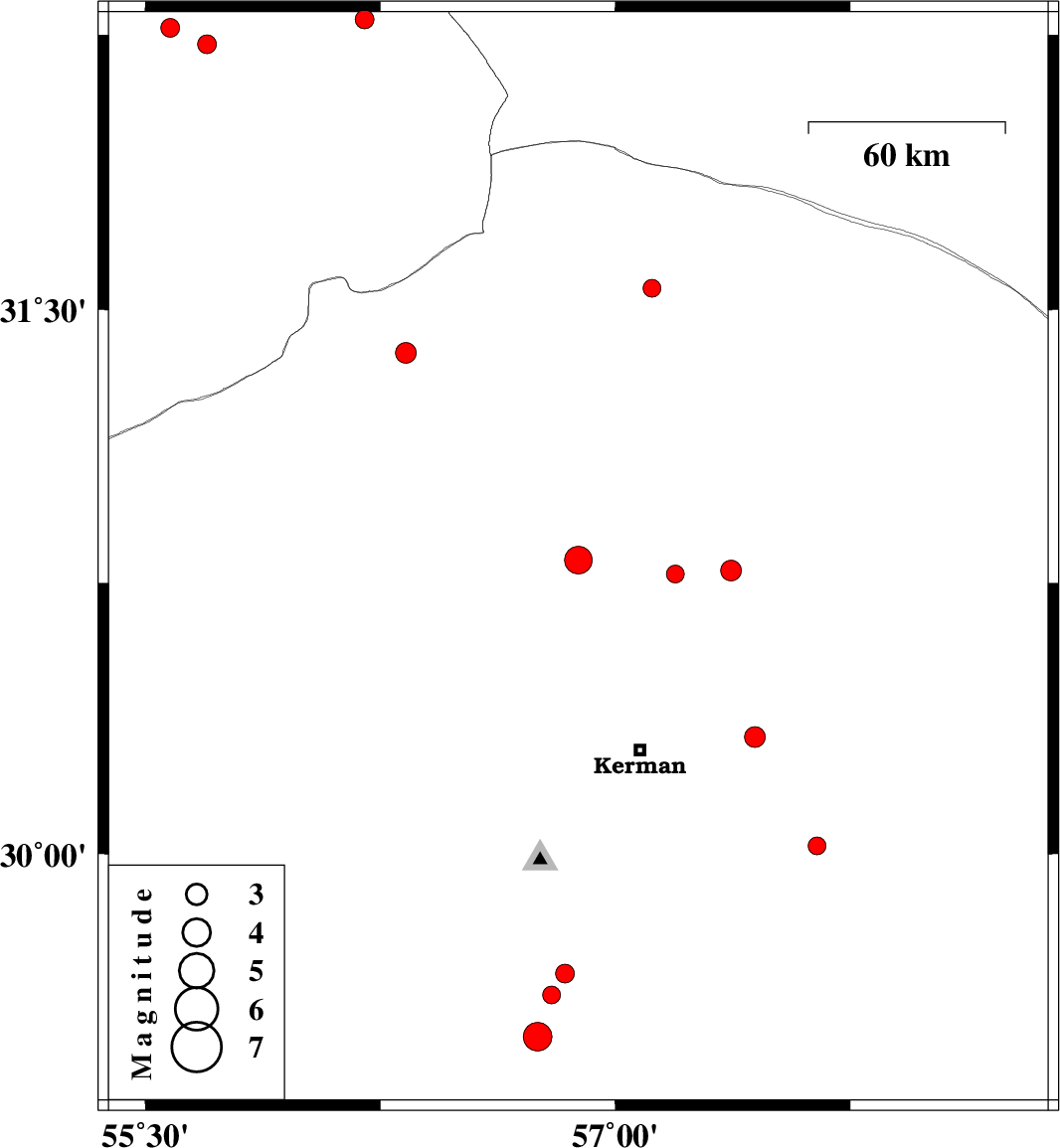 | 2018/11/16 | 16:10:13.3 | 19:40:13.3 | 30.784 | 57.369 | 14 | ML2.9 | Kerman Province, 62 km North-East of Kerman | ||