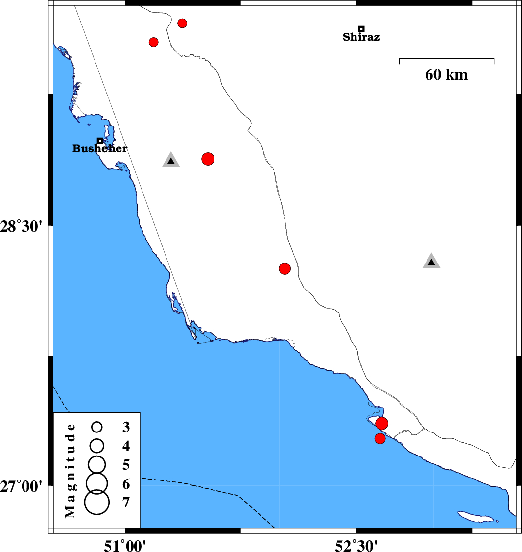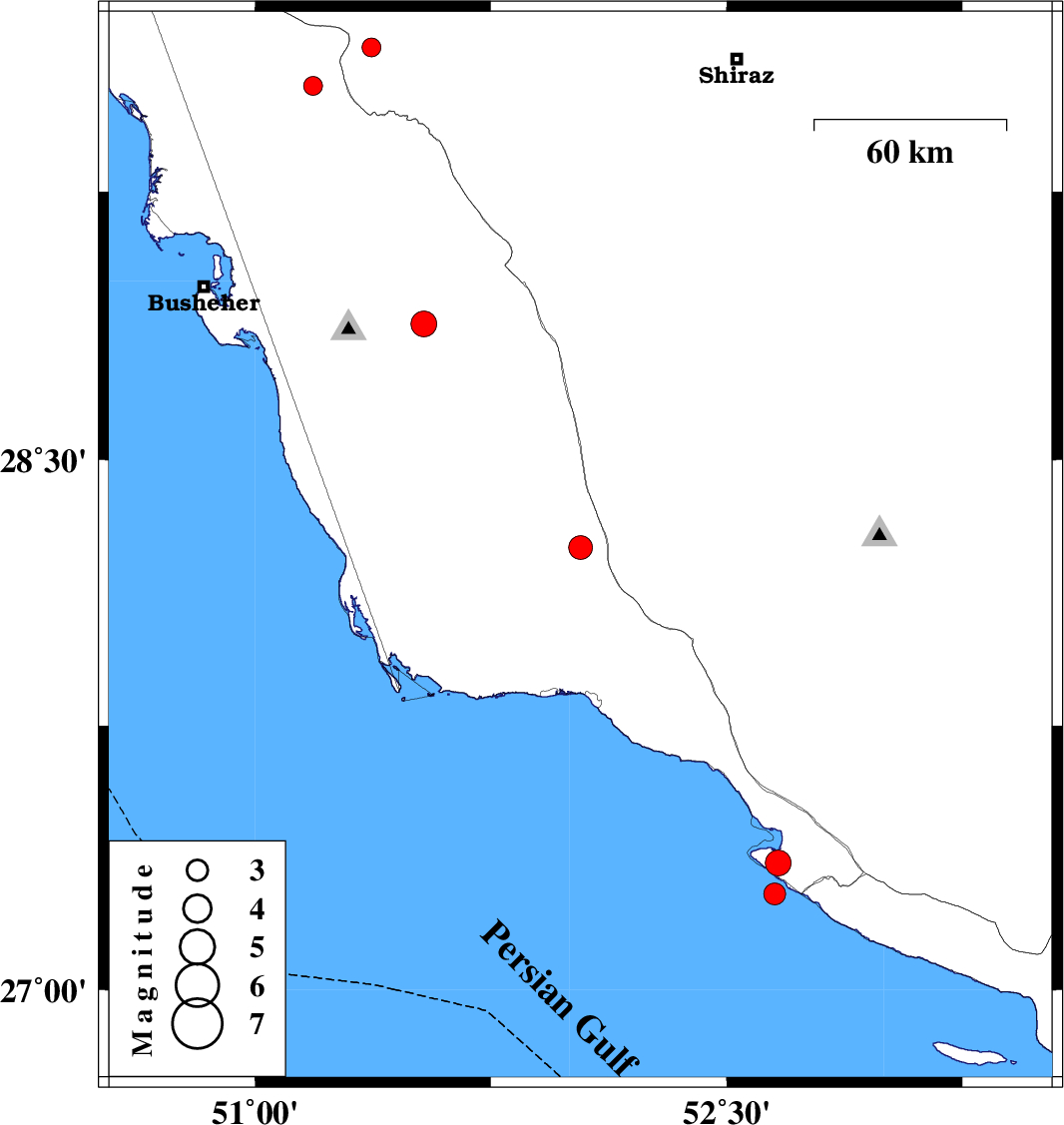 | 2018/11/05 | 04:46:17.0 | 08:16:17.0 | 27.361 | 52.664 | 16 | ML3.6 | Bushehr Province, 30 km South-West of Mehr |