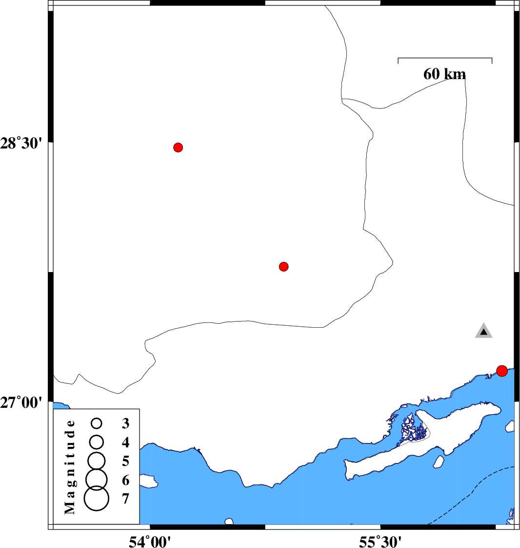| 2018/11/27 | 22:56:43.6 | 02:26:43.6 | 27.782 | 54.87 | 15 | ML2.7 | Fars Province, 54 km North-East of Lar | ||
