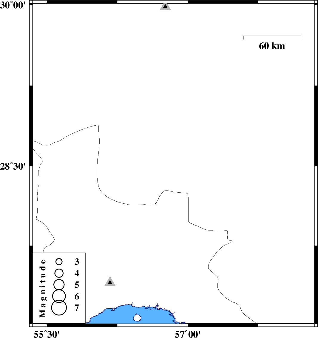 | 2018/11/30 | 12:53:52.9 | 16:23:52.9 | 28.511 | 56.848 | 14 | ML2.6 | Kerman Province, 84 km South-East of Baft |