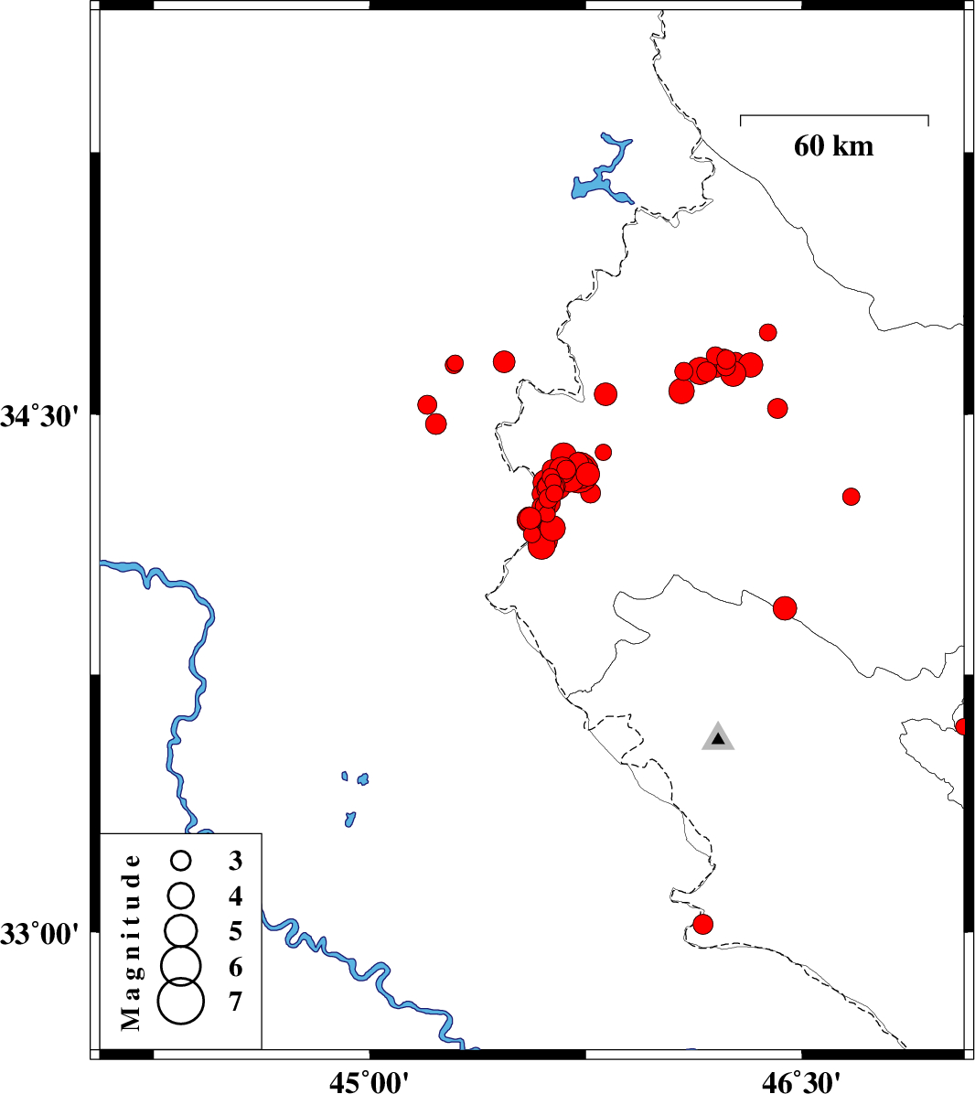 | 2018/11/27 | 06:36:34.3 | 10:06:34.3 | 34.34 | 45.668 | 16 | ML4.1 | Kermanshah Province, 21 km South of Qasr-E-Shirin | ||