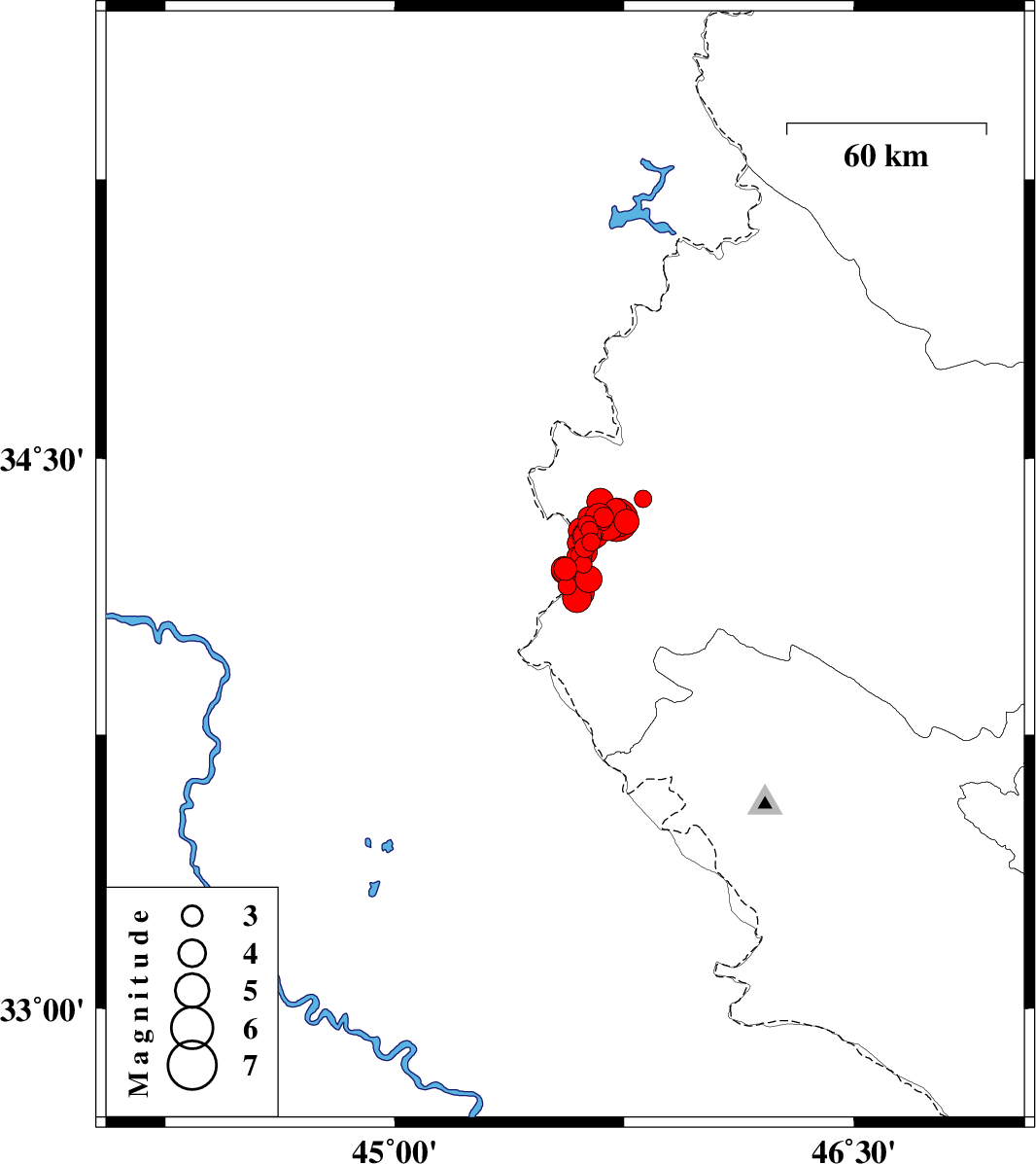 | 2018/11/27 | 06:36:34.3 | 10:06:34.3 | 34.34 | 45.668 | 16 | ML4.1 | Kermanshah Province, 21 km South of Qasr-E-Shirin | ||