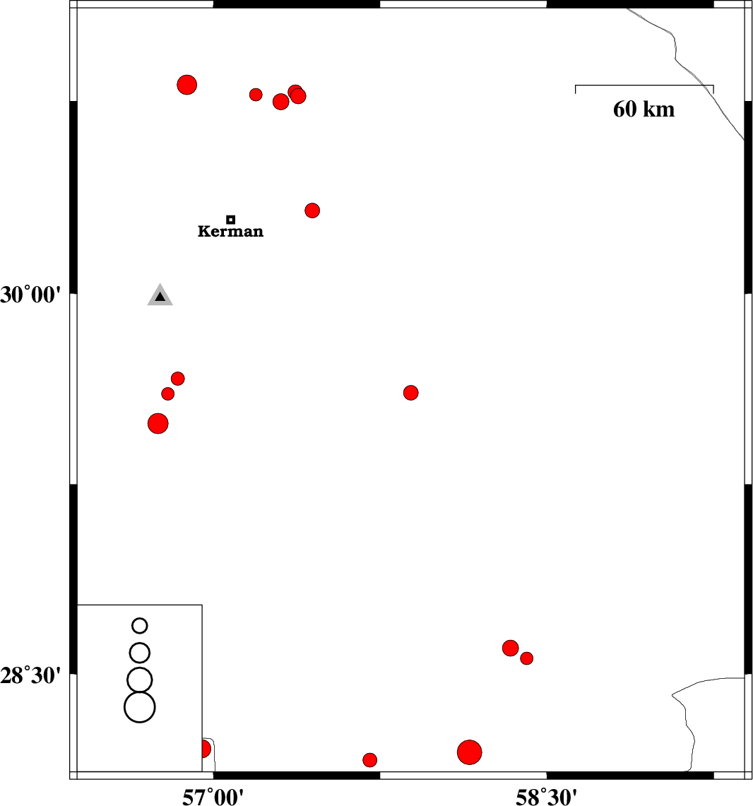 2018/11/09 | 19:25:55.7 | 22:55:55.7 | 29.606 | 56.796 | 14 | ML:2.5 | Kerman Province, 41 km South-East of Bardsir | ||