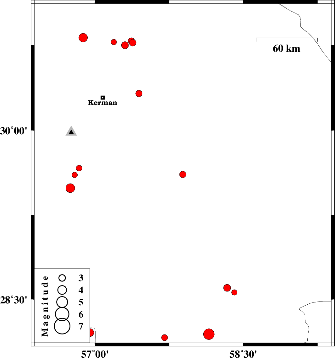 | 2018/11/04 | 02:13:08.1 | 05:43:08.1 | 28.603 | 58.336 | 14 | ML3.3 | Kerman Province, 56 km South of Bam |