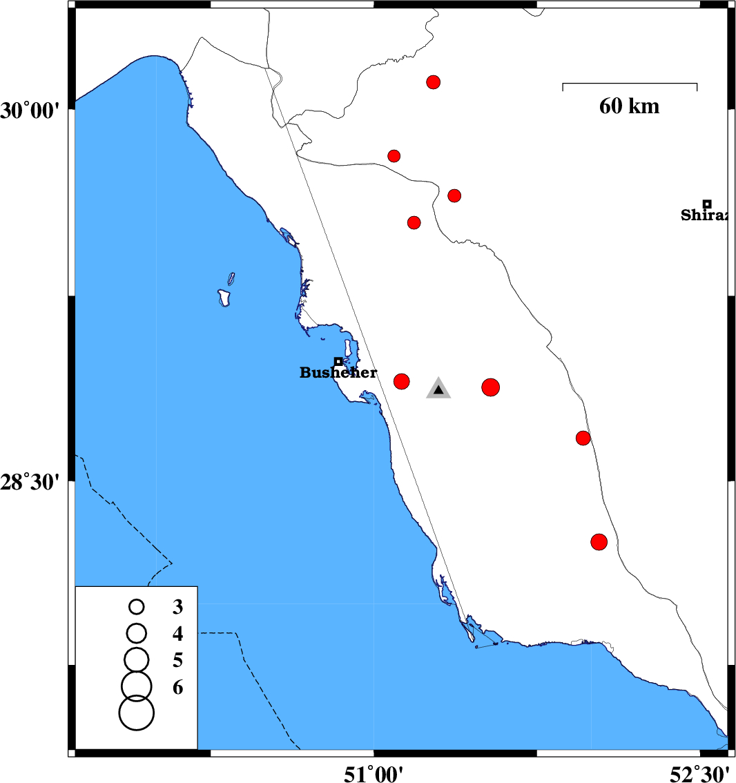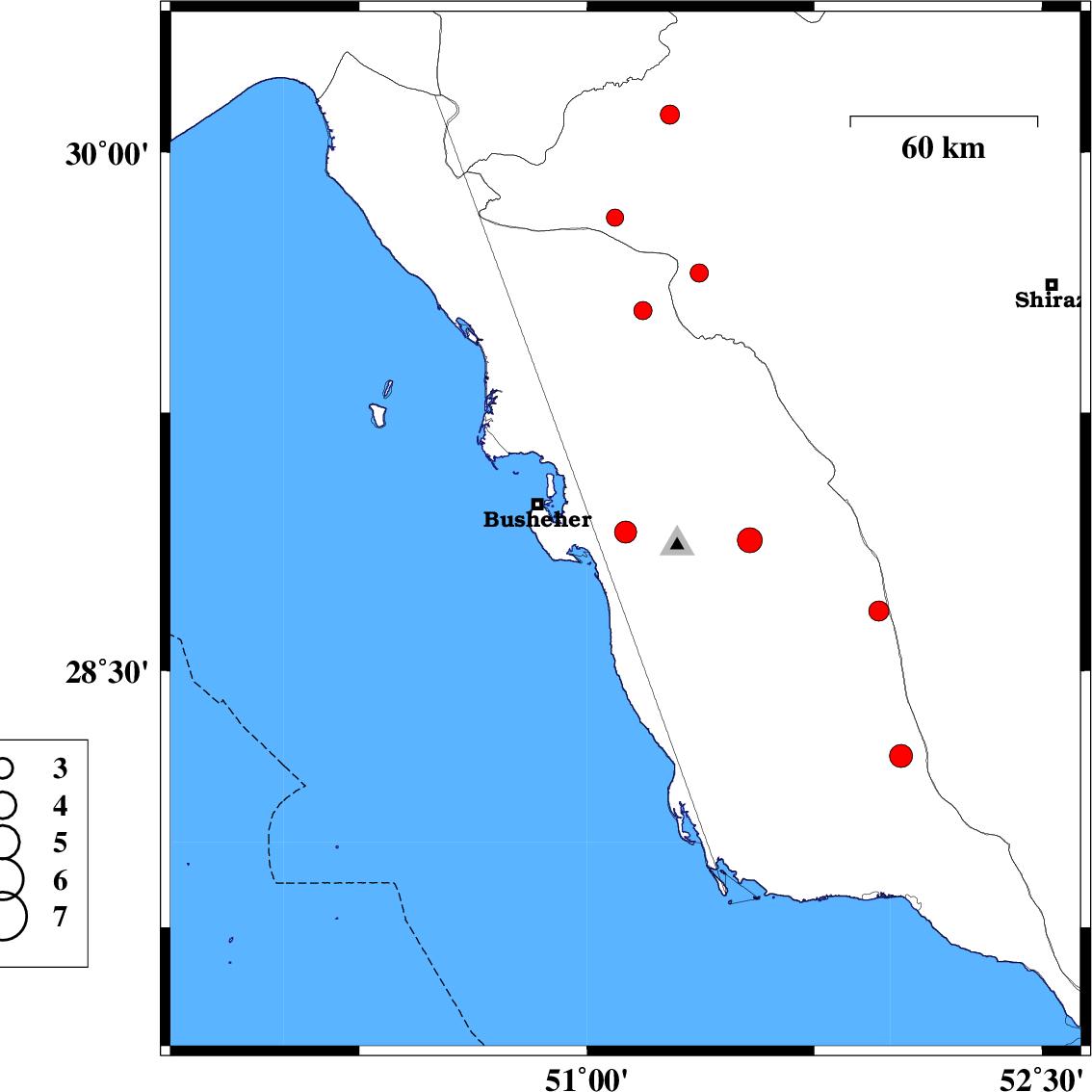 | 2018/11/12 | 05:15:42.2 | 08:45:42.2 | 29.544 | 51.184 | 14 | ML2.7 | Bushehr Province, 31 km North of Borazjan | ||