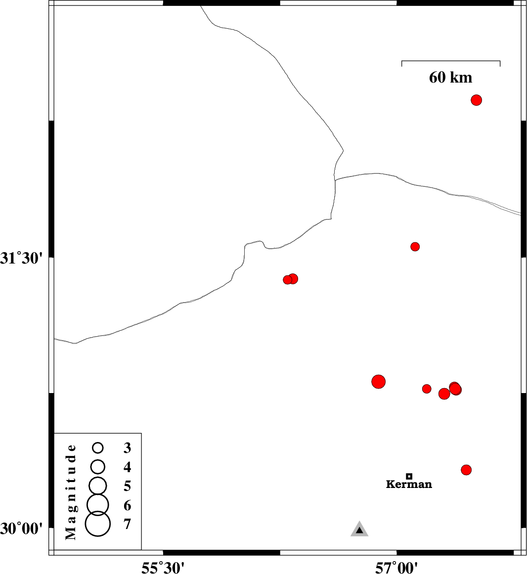 | 2018/11/16 | 16:10:13.3 | 19:40:13.3 | 30.784 | 57.369 | 14 | ML2.9 | Kerman Province, 62 km North-East of Kerman | ||
