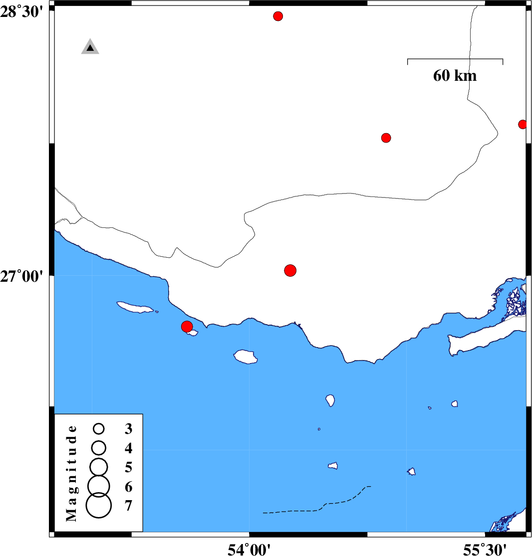 | 2018/12/05 | 07:38:51.7 | 11:08:51.7 | 27.028 | 54.26 | 15 | ML3.4 | Hormozgan Province, 21 km South-West of Bastak | ||