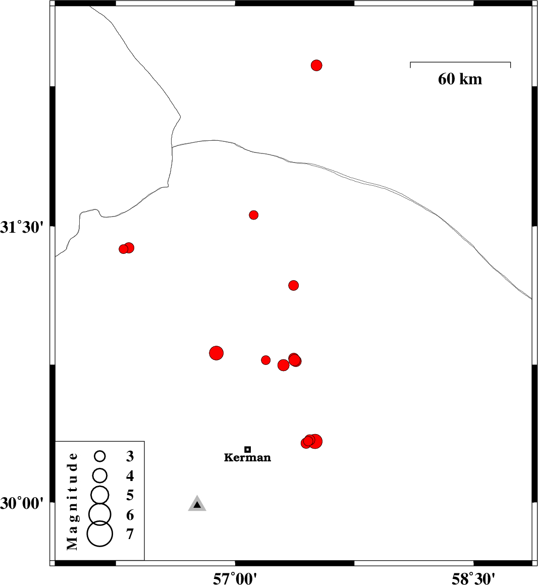 | 2018/11/27 | 08:41:32.7 | 12:11:32.7 | 30.747 | 57.304 | 14 | ML3.3 | Kerman Province, 55 km North-East of Kerman | ||