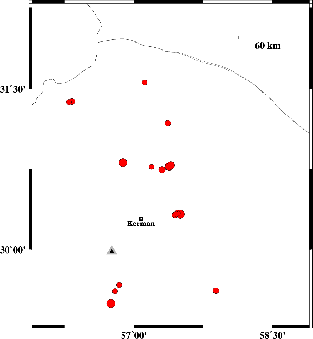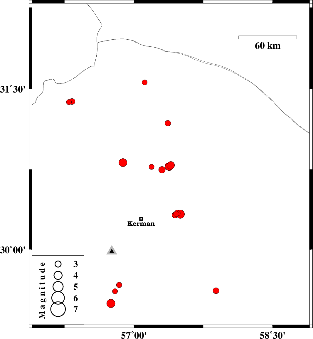 | 2018/11/16 | 16:10:13.3 | 19:40:13.3 | 30.784 | 57.369 | 14 | ML2.9 | Kerman Province, 62 km North-East of Kerman | ||