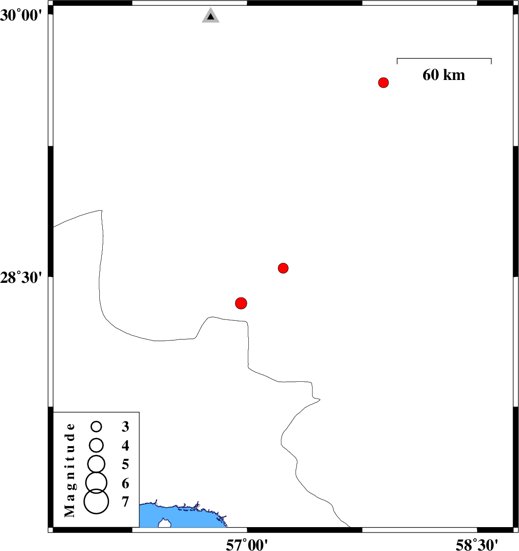 | 2018/12/02 | 15:44:54.4 | 19:14:54.4 | 29.611 | 57.888 | 14 | ML2.9 | Kerman Province, 72 km North-West of Bam |