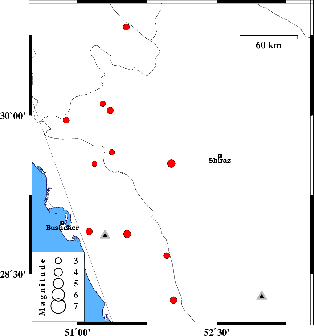 | 2018/11/12 | 05:15:42.2 | 08:45:42.2 | 29.544 | 51.184 | 14 | ML2.7 | Bushehr Province, 31 km North of Borazjan |