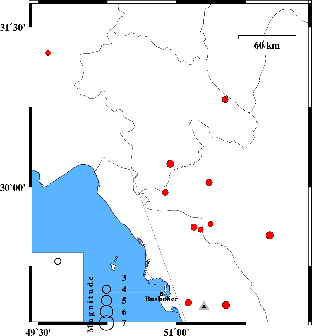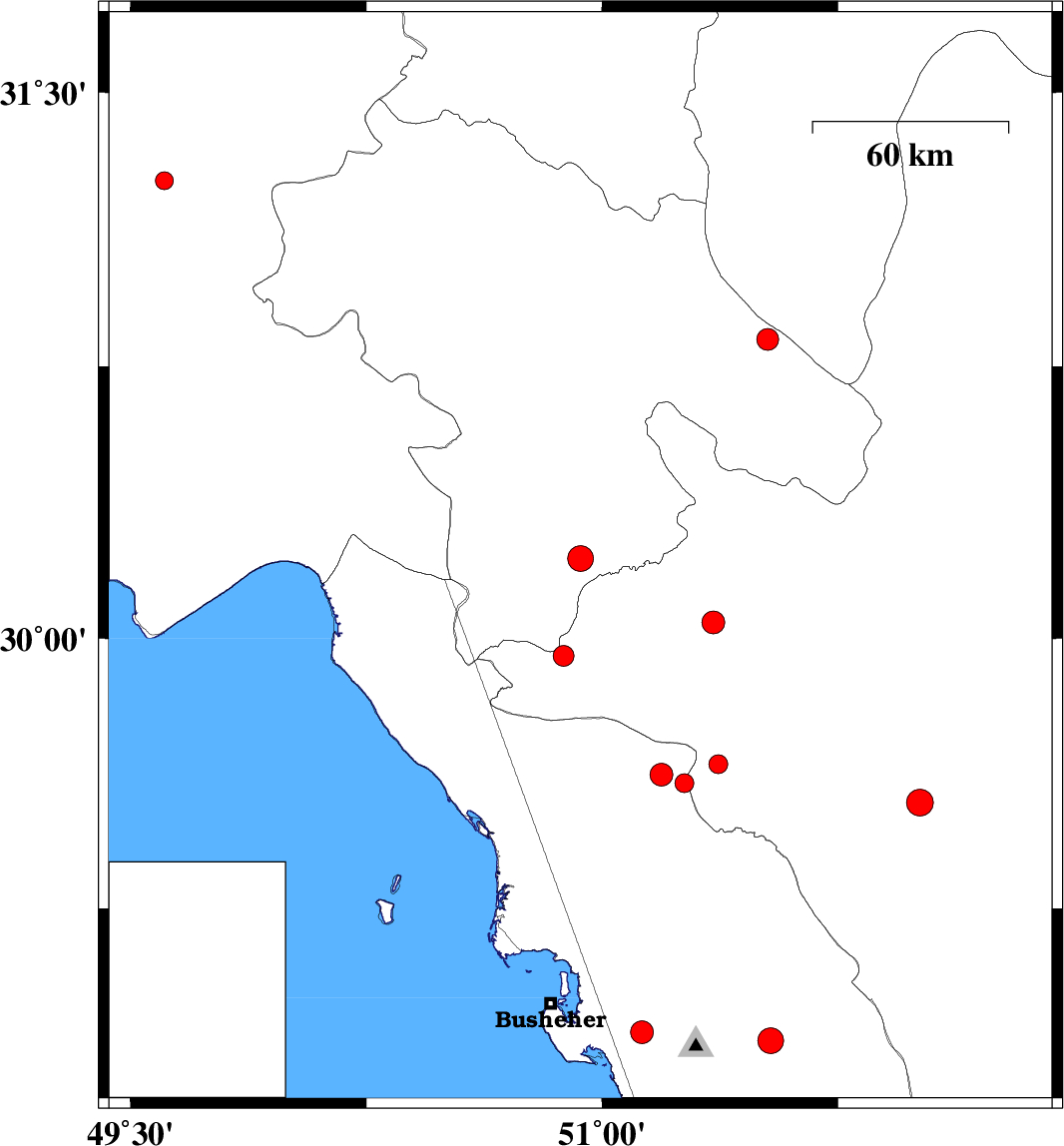 | 2018/12/13 | 12:29:09.7 | 15:59:09.7 | 29.599 | 51.261 | 17 | ML2.7 | Bushehr Province, 38 km North of Borazjan | ||