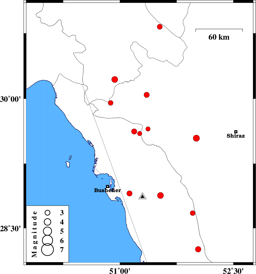 | 2018/12/13 | 12:29:09.7 | 15:59:09.7 | 29.599 | 51.261 | 17 | ML2.7 | Bushehr Province, 38 km North of Borazjan | ||